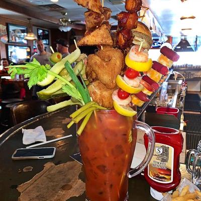 A staple morning cocktail for many Wisconsin bars, the Sobelman's Bloody Mary is made with our zesty, house-made Bloody Mary mix. Topped with signature garnishes, every Bloody Mary comes with a colby-jack cheese, a pickled Polish sausage, a pickled mushroom, a pickled Brussels sprout, an asparagus, a celery stalk, a green onion, and on another toothpick a shrimp, a lemon wedge, and a grape tomato.
